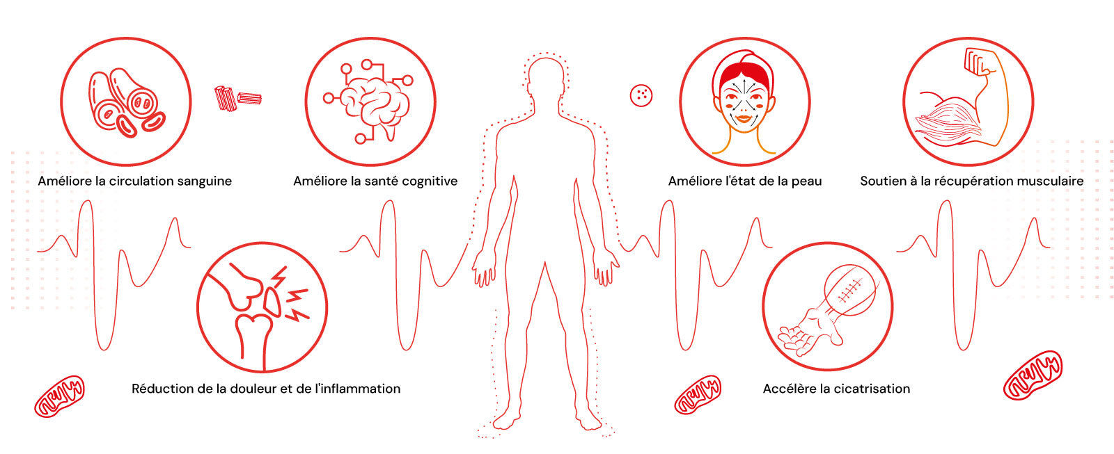 La lumière rouge et infrarouge génèrerait des effets bénéfiques remarquables sur notre corps. Elle agit au niveau cellulaire pour améliorer notre bien-être.